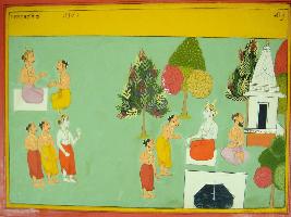 | Description / विवरण | Miniature painting based on Mahabharat - Gada parva. The lower right depicts Balram is going for pilgramage. At the left side Balram is sitting in the hermitage of a sage and one Brahman is paying respect to him. |