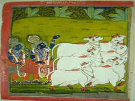 | Description / विवरण | Miniature painting depicting Krishna and Balram moving with cows for herding them. |