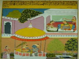 | Description / विवरण | Miniature painting based on Rasikpriya, depicting Radha sitting with her friend in a palace at upper left side. A female attendant is shown standing nearby. At the lower part, Krishna is shown sitting with Radha in a garden. |