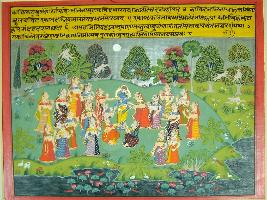 | Description / विवरण | Miniature painting based on Krishna Lila depicting Krishna in standing pose with halo behind and surrounded by number of Gopis. Gopis are in beautiful dresses and well ornamented. Two Gopis seated and are touching the feet of Krishna. |