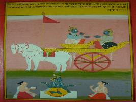 | Description / विवरण | Miniature painting based on Shri Bhagwat Gita. It depicts Krishna preaching Arjun that whoever listen to our talks will become a served man and will be a part of my knowledge. |