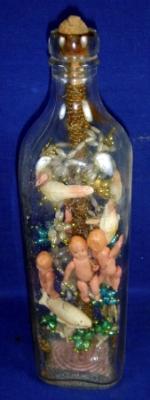 | Description / विवरण | Low neck glass bottle containing a tree decorated with small babies, birds, fishes and animal figures and beads. |