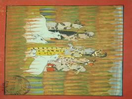 | Description / विवरण | Miniature painting depicting with Krishna standing with four gopas and cow in the middle. In the back ground field is depicted. |