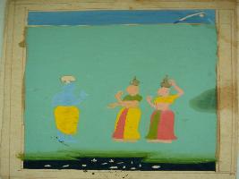 | Description / विवरण | Miniature painting of Krishna and gopis, Krishna is teasing them, while they are carrying pitcher on their head. It is an incomplete painting. |