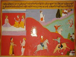 | Description / विवरण | Miniature painting based on Sanskrit drama - Prabodh Chandrodaya depicting a king with two sages on the right top corner of the painting, below them a man standing with a woman, while on the left part of the painting a fight scene between three persons is being depicted and also a king fighting with a man. |