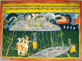 | Description / विवरण | Miniature painting based on Harivansha depicting Krishna lifting Govardhan Parvat, on his single finger and people taking shelter below it. While on the left upper corner, Shiv is seen with bow and arrows in his hands. |