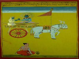 | Description / विवरण | Miniature painting based on Shri Bhagwat Gita. It depicts Krishna preaching Arjun that when you will know the meaning of Veda and do meditation then you will find salvation. |