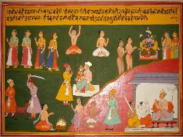 | Description / विवरण | Miniature painting based on Sanskrit drama - Prabodh Chandrodaya depicting Sarada describing that Bhakti towards Vishnu eliminates Kama , Krodh and Moha from mind. At the upper left worshipping of Vishnu is depicted. |