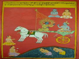 | Description / विवरण | Miniature painting based on Shri Bhagwat Gita. On the painting Arjun ask Krishna about the dharma while Arjun asking that if intelligence is there valuable than why you couple me to adharma. |