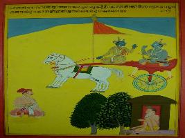 | Description / विवरण | Miniature painting based on Shri Bhagwat Gita. It depicts Krishna preaching Arjun that the person who do not perform Karma will not attain moksha. |