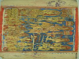 | Description / विवरण | Miniature painting depicting a Jaina deity female at the right side sitting in lalitasana, holding a flower in her left hand. Below the deity, four stag are seen facing left. At the centre a male deity is seen riding an elephant. A female attendant offering wine to him. At the left side of him, two man on horse are seen. At the lower left side three horse rider and on warm sitting in chariot are depicted. |