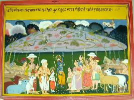 | Description / विवरण | Miniature painting based on Harivansha depicting scene in which Krishna holds Govardhan mountain on his little finger villages, cows and Nanda too observing such miracle. |