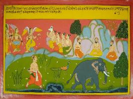| Description / विवरण | Miniature painting based on Mahabharat - Vana parva. The painting depicts that Bhim is travelling towards Gandhmardhan hill where he sees that the sages are worshipping and Apsaras are dancing among peacock and elephant. |