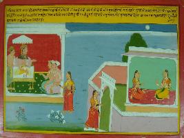 | Description / विवरण | Miniature painting based on Mahabharat - Virat parva. The painting depicts the queen of Virat and Draupadi. It says that Draupadi is right but Kichak is wrong, who falls in love with Draupadi. On the other hand the king of Virat is talking with Kanka. |