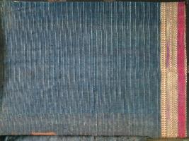 | Description / विवरण | This is breast cloth blouse with silk and cotton border, along with horizontal thin lines in white colour with blue background. It has thick red border-divided into three decorated sections. It has embroidery work also. |