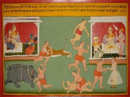 | Description / विवरण | Miniature painting based on Mahabharat - Virat parva. Women are talking with king Virat and queen. Bhim is depicted fighting with 8 wrestlers and defeating him and he gets reward from the king. He is also depicted fighting with a tiger and an elephant. |