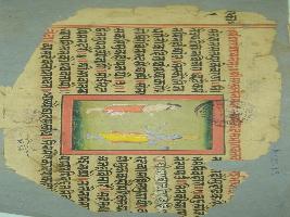 | Description / विवरण | Miniature painting with illustration in all over having eleven lines, written in red and black colour, in Sanskrit language. Painting is in middle of illustration. Here a sage is depicted standing with folded hand and praying to Lord Vishnu who is depicted in left side. |