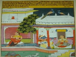 | Description / विवरण | Miniature painting based on Rasikpriya depicting Krishna and young Radha in conversation in a palatial balcony. At the roof of the balcony two peacocks are seen. At the lower right side a female is seen sitting on a Asana. |
