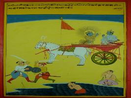 | Description / विवरण | Miniature painting based on Shri Bhagwat Gita. Krishna and Arjun where Krishna says Arjun about Karma, while a bathing seem also seen. |