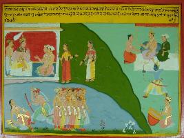 | Description / विवरण | Miniature painting based on Mahabharat - Virat parva. On the painting Drapadi is informing about the battle of Kichak with a demon and on her hand Bhim is seen in front of king Virat. |