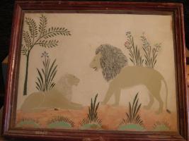 | Description / विवरण | Painting of a lion, framed in wooden frame depicting a seated lioness and a standing lion in forest. |