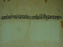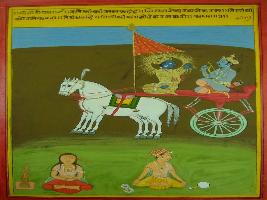 | Description / विवरण | Miniature painting based on Shri Bhagwat Gita. Krishna and Arjun where Krishna says about Karma to Arjun while a sage and man is seen in Dhyanamudra. |