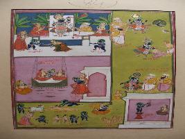 | Description / विवरण | It is a painting of childhood of Sri Krishna. Yasoda, Nand, child form Krishna, Gopi, Gopika etc. are shown. Srikrishna is playing with his friends. Banana plants is shown at top. |