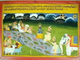 | Description / विवरण | Miniature painting based on Harivansha depicting Krishna and Radha with cows, in the next scene some king arrives to meet Krishna both are sitting together and in the last scene Krishna, Balram, Radha and other people going back to home. It is incomplete painting. |
