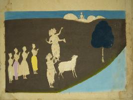 | Description / विवरण | Miniature painting depicting lord Brahma with a cow and other gods standing on a river side. It is an incomplete painting. |
