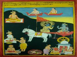 | Description / विवरण | Miniature painting based on Shri Bhagwat Gita. It depicts Krishna preaching Arjun that yagna that performed by human will give strength to Devtas and Devtas will give happiness to men from that strength. Thus both of them give happiness to each other. |