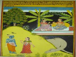 | Description / विवरण | Miniature painting based on Rasikpriya depicting Radha is sitting at the upper left part. At the lower right part, Krishna shown standing and being told about the love of Radha. To their left, a camel is shown eating grass. |