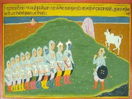 | Description / विवरण | Miniature painting based on Mahabharat - Gada parva. The painting depicts that Duruodana challenging Pandavas for fighting and asked them to come one by one. |