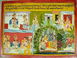 | Description / विवरण | Miniature painting based on Harivansha depicting Kansa the king of Mathura sitting with his minister s and talking on very important topic. In the right side Vasudev Krishna. It is incomplete painting. |