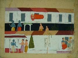 | Description / विवरण | Miniature painting depicting four armed Vishnu with worshippers in lower right part. In part loving couple and village life is depicted. It is an incomplete painting. |