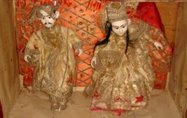 | Description / विवरण | Doll of a Japanese king and green sitting on a pedestal. They are wearing a jari embroidered royal costume. Most parts of the costumes are worm out. They are wearing crowns and eyes are painted with black colour. At the background red coloured embroidered cloth is visible and both of them are kept in a box. |