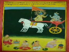 | Description / विवरण | Miniature painting based on Shri Bhagwat Gita. It depicts Krishna preaching Arjun that he who eat the Bhoga of Yagna will get rid of all sins. But he who cooked for his grandson and himself ate all will commit sin. |