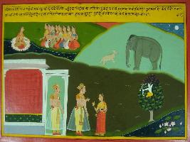 | Description / विवरण | Miniature painting based on Mahabharat - Virat parva. The painting depicts that Kichak meets Draupadi and expressing his love to Draupadi while Kamdev is also seen in the painting. |