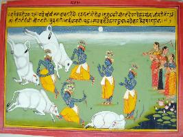 | Description / विवरण | Miniature painting based on Harivansha depicting a part of Krishna Lila. One bull is attacking Krishna is shown fighting with him at upper right part. At the lower right part he is shown taking out bull horn and bull is finally settled down at the extreme left and gopi is shown standing. |