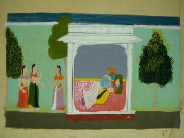 | Description / विवरण | Miniature painting depicting loving union of Radha-Krishna inside palace. At the outside, gopis are shown talking among themselves. It is an incomplete painting. |