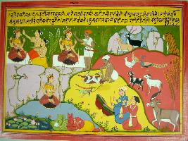 | Description / विवरण | Miniature painting based on Harivansha depicting Devi Parvati probably worshipped by two Brahmans. Next to it Devi Parvati is also praised by a Vyadh who is seen talking an animal. Below him two musicians are seen. Two demons are seen sleeping near a pond. At the left side animals are seen. |
