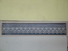 | Description / विवरण | Nottingham machine lace Dentella Mattese . It is a machine made cotton thread lace designed with sixteen half diamond shaped pattern and floral designs are also used on it. The upper margin border line is designed with vertical strips and a broad chain |
