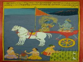 | Description / विवरण | Miniature painting based on Shri Bhagwat Gita. It depicts Krishna preaching Arjun that through cereals creatures survives, through cloud cereals grows, and through yagna rain occurs and yagna occurs due to Karma, thus all are inter related. |