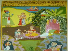 | Description / विवरण | Miniature painting based on Rasikpriya depicting at the upper right Krishna being given the message of Radha. Below them sitting on a lotus flower a waiting for her lover with a decorated bower. At the lower left a female with tiger head is depicted sitting with her child. At the lower right a Nagkanya is depicted. |