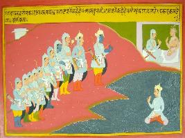 | Description / विवरण | Miniature painting based on Mahabharat - Gada parva. Where Sanjay is informing Dhitrastra about the conservation in between Krishna and Druyodhana. In the painting Pandavas are seen along with their army and Krishna. In the painting Pandavas are seen along with their army and Krishna and Duryud hana is sitting in the lake. |