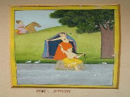 | Description / विवरण | It is a painting, depciting a lady shown bathing in a pond, is a semi nude. She is followed by an attendant hiding her with dupatta, shown standing. While in foreground, pond is seen, in the background a horse rider is seen. |