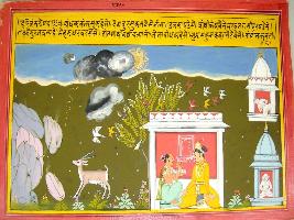 | Description / विवरण | Miniature painting based on Harivansha depicting stormy night with heavy rainfall and dark cloud, animals are shown running to safer palace, Rocks is falling from cliff. At the two temple is being depicted and upper one s idol is being fall. At the middle a sage is talking to another man in a palace. |