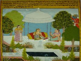 | Description / विवरण | Miniature painting based on Rasikpriya depicting Radha on couch in centre planked by two attendants, whereas, Krishna is admiring her beauty from hiding behind a tree. |