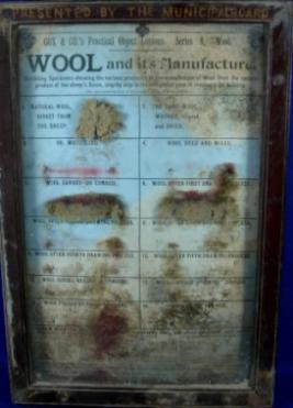 | Description / विवरण | Specimens showing the various processes in the manufacture of wool from the natural product of the sheep s fleece, step by step to the completed yarn in readiness for knitting. The paper is stained and wool is deteriorating, kept in a glass and wood frame. |