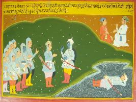 | Description / विवरण | Miniature painting based on Mahabharat - Gada parva. On the painting Ramdevas and Krishna is seen along with their army where Yudhisthir ask Duruodhana to fight with them. On the painting Duruodhana is seen resting in the lake. |
