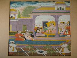 | Description / विवरण | It is a painting, depicting Kansa the demon and Narada a devine hermit , negotiating with each other. On an arched palace, demon is shown seated on a yellow throne, while Narada on ground. In foreground attendant and garden is seen. |